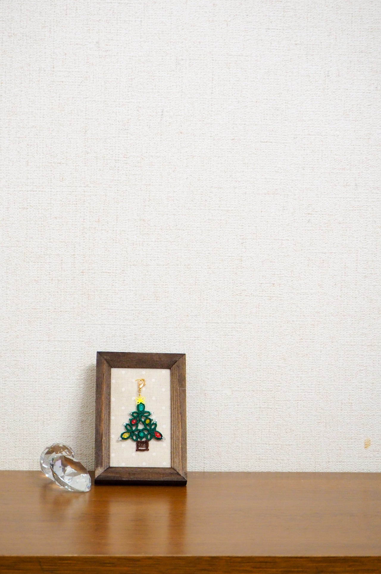 濃い緑のクリスマスツリーチャーム★小雪舞う小さな額縁★イルミネーションみたいにキラキラ可愛いツリー